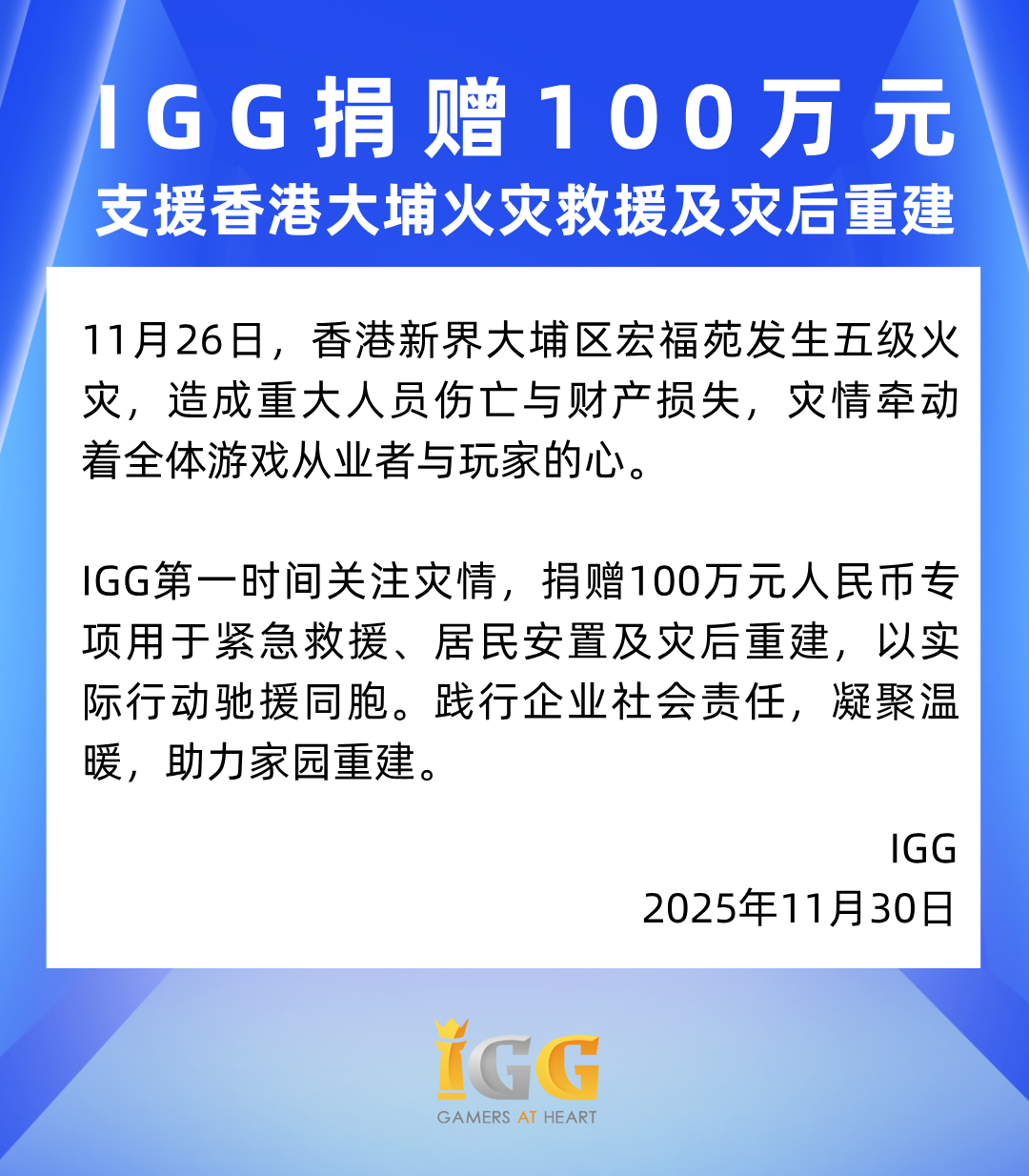 11月26日,香港新界大埔区宏福苑发生五级火灾,造成重大人员伤亡与财产损失,灾情牵动着全体游戏从业者与玩家的心。